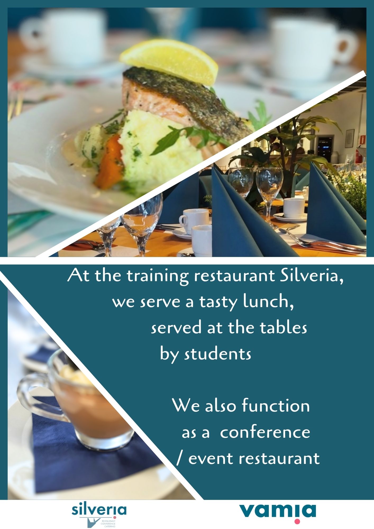 Home You are welcome to arrange your meetings with us and enjoy good food and service at the same time From Cafe Silveria you can also buy freshly baked products as Take Away Accessibility in restaurant Silveria You can enter our restaurant with a wheelchair along the ramp through the main entrance and we have a wheelchair-accessible toilet in our premises. You can also use strollers in our interior, and our restaurant also has high chairs. Recent News Teaching restaurant Silveria’s environmental policy The teaching restaurant Silveria is part of the vocational school Vamia. The restaurant trains future employees in the industry. Environmental awareness and environmental responsibility are parts of our daily operation. The participation in the Green Key environmental program brings this expertise to the customers attention. Read more about Green Key Read more about Teaching restaurant Silveria’s environmental policy